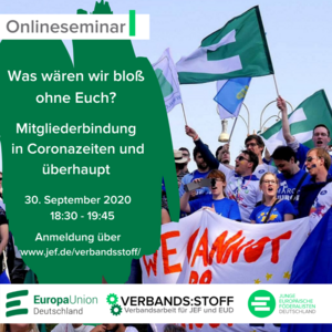 Europa-Union und JEF laden alle Ehrenamtlichen ein zur nächsten Verbands:stoff online Akademie „Was wären wir bloß ohne Euch? Mitgliederbindung in Coronazeiten und überhaupt“. Sie findet am Mittwoch, 30. September 2020 von 18.30 bis 19.45 Uhr auf der Online-Plattform edudip statt. Besonders jetzt in Corona-Zeiten ist es wichtig, den Kontakt mit den Mitgliedern zu halten, sie einzubinden und ihnen spannende Veranstaltungsangebote zu machen. Bei dem Online-Seminar gibt es neben dem ABC erfolgreicher Mitgliederbetreuung um Tipps aus…