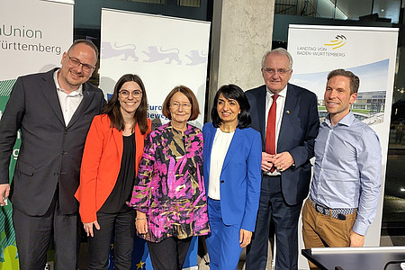 The Europa-Union Luxemburg was represented at the New Year's reception of the European associations at the invitation of the Europa-Union Baden-Württemberg in the state parliament of Baden-Württemberg by our chairman Stefan Kohler (on the left in the photo) and his deputy Manuel Schöb (right). After the formal part, there was an opportunity for an informal exchange with the President of the State Parliament Muhterem Aras MdL (3rd from right), the President of the Europa-Union Deutschland e.V. Rainer Wieland (2nd from right), the EUD State Chairwoman Evelyne Gebhardt (3rd from left) and the State Chairwoman of the Young Europeans - JEF Baden-Württemberg e.V. Sarah Reisinger (2nd from left).