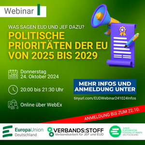 Die großen politischen Prioritäten der Europäischen Kommission für die nächsten Jahre stehen fest. Unter anderem werden die Stärkung der Wettbewerbs- und Verteidigungsfähigkeit der EU im Fokus stehen. Die EU soll außerdem intensiv an ihrer Erweiterung arbeiten. Dieses Webinar der verbandsstoff Reihe beleuchtet die politischen Themen, die in den nächsten Jahren auf der Agenda der EU stehen und wie die EUD und JEF dazu stehen.